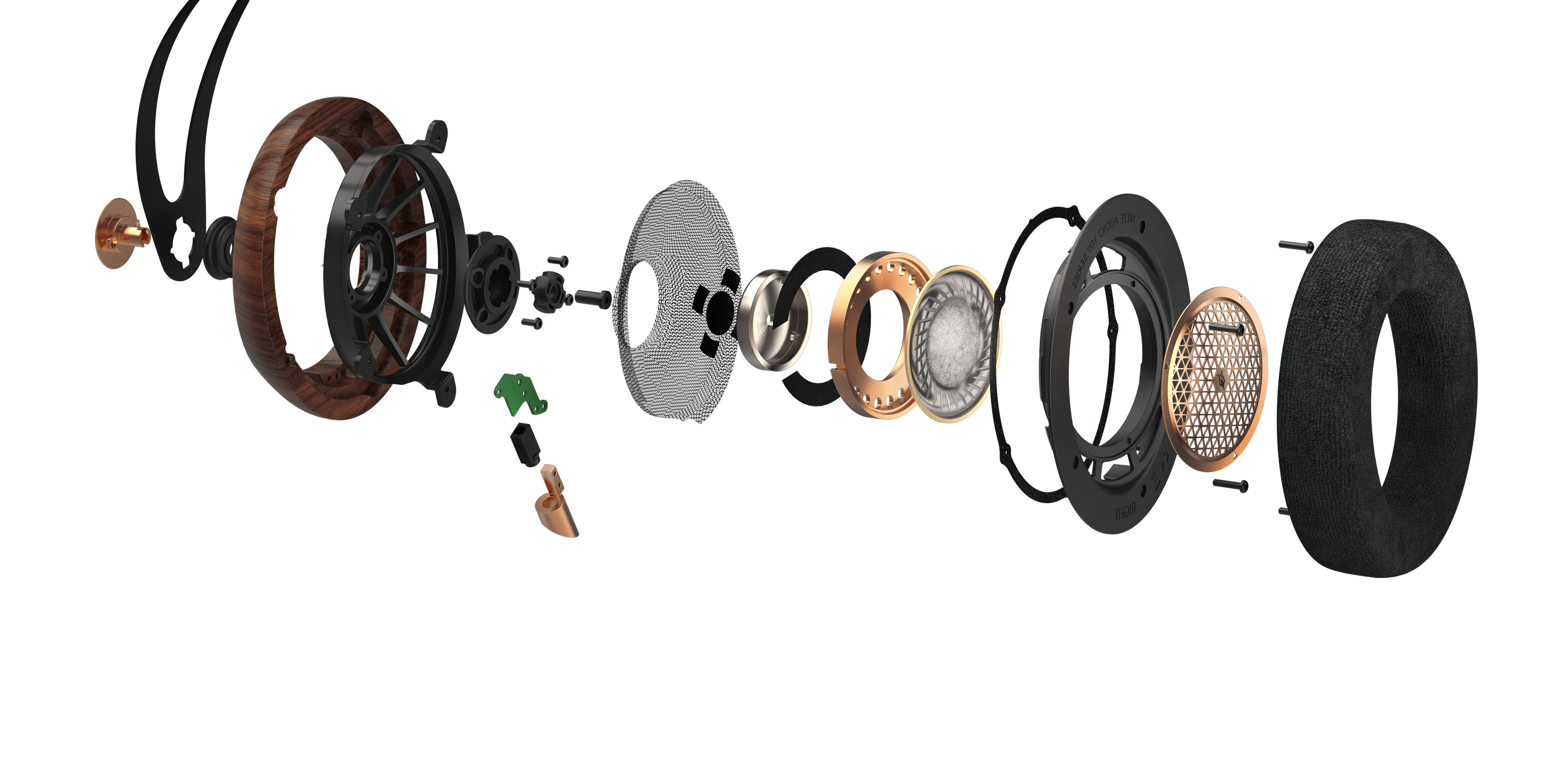 To add stiffness at the same time, Meze developed a combination of beryllium-coated polymer, a cellulose and carbon-fiber composite, and a copper–zinc alloy. In addition, the spider that keeps the diaphragm aligned is made as acoustically transparent as possible—supporting the airy presentation together with the outer grille.