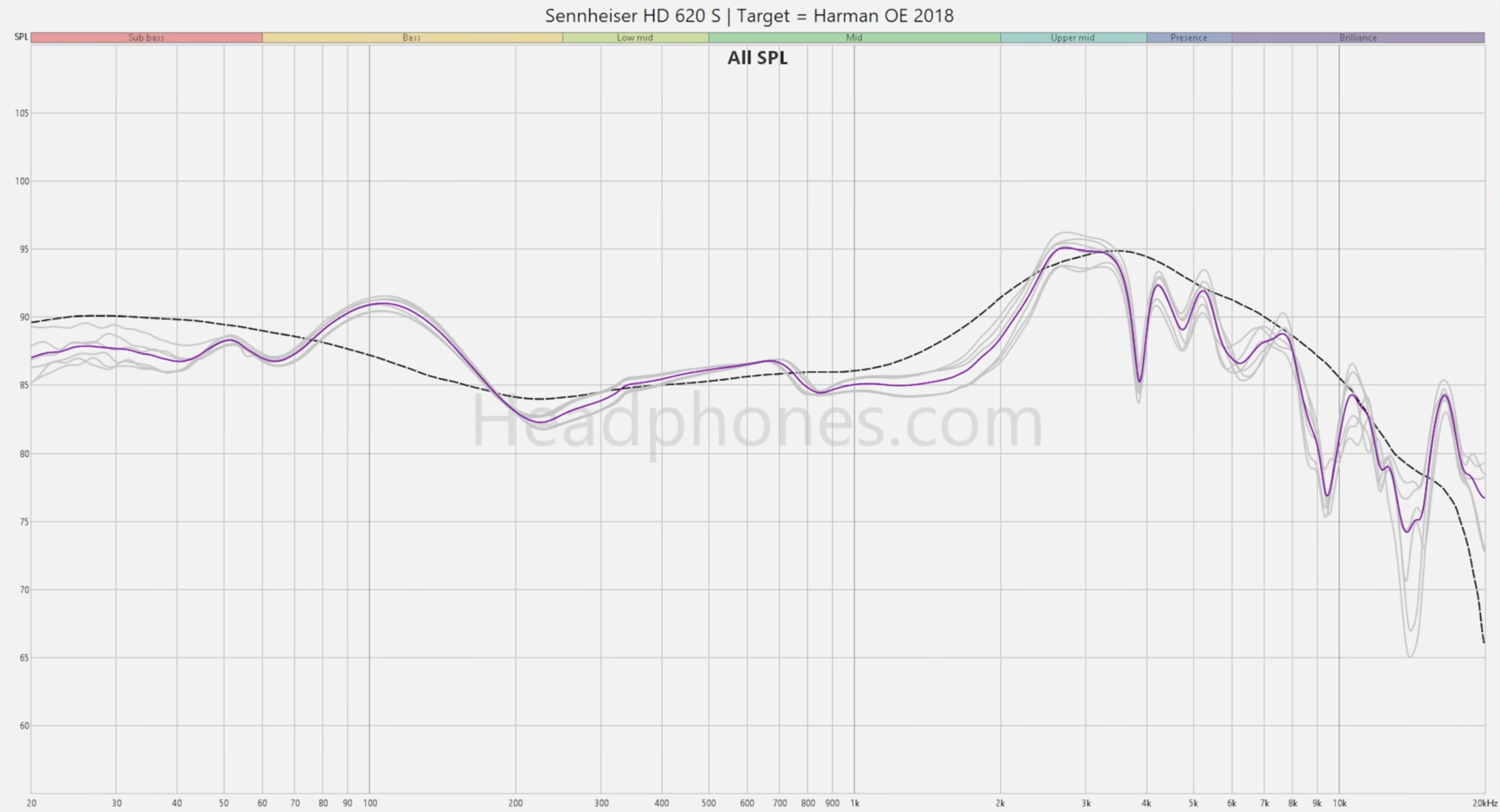 La linea nera tratteggiata rappresenta il valore target Harman, una risposta in frequenza di riferimento sviluppata sulla base delle preferenze dei consumatori. La linea rosso/blu rappresenta la misura delle HD620S. In pratica, mostra quanto la risposta in frequenza delle cuffie si discosti dal valore target. Si noti, tuttavia, che il valore target è molto smussato e che non è necessario attenersi strettamente al valore target di Harman perché una cuffia suoni bene.